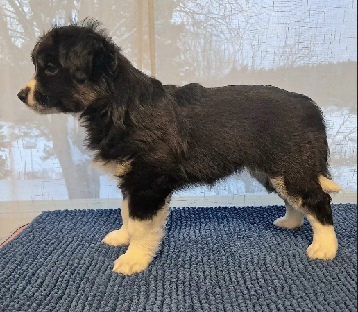 Meya tulee hyvin toimeen muiden koirien kanssa ja osoittaa selvästi sosiaalista luonnettaan. Hän on Tobyn ja Sansan jälkeläinen.